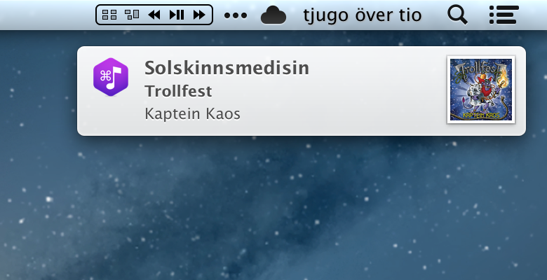 So apart from being able to control your music player with the “multi-media keys” that you normally have on an Apple keyboard, Mousai also lets you see the current playing track from your music player, either as a notification or as an album artwork by right clicking the menu item.