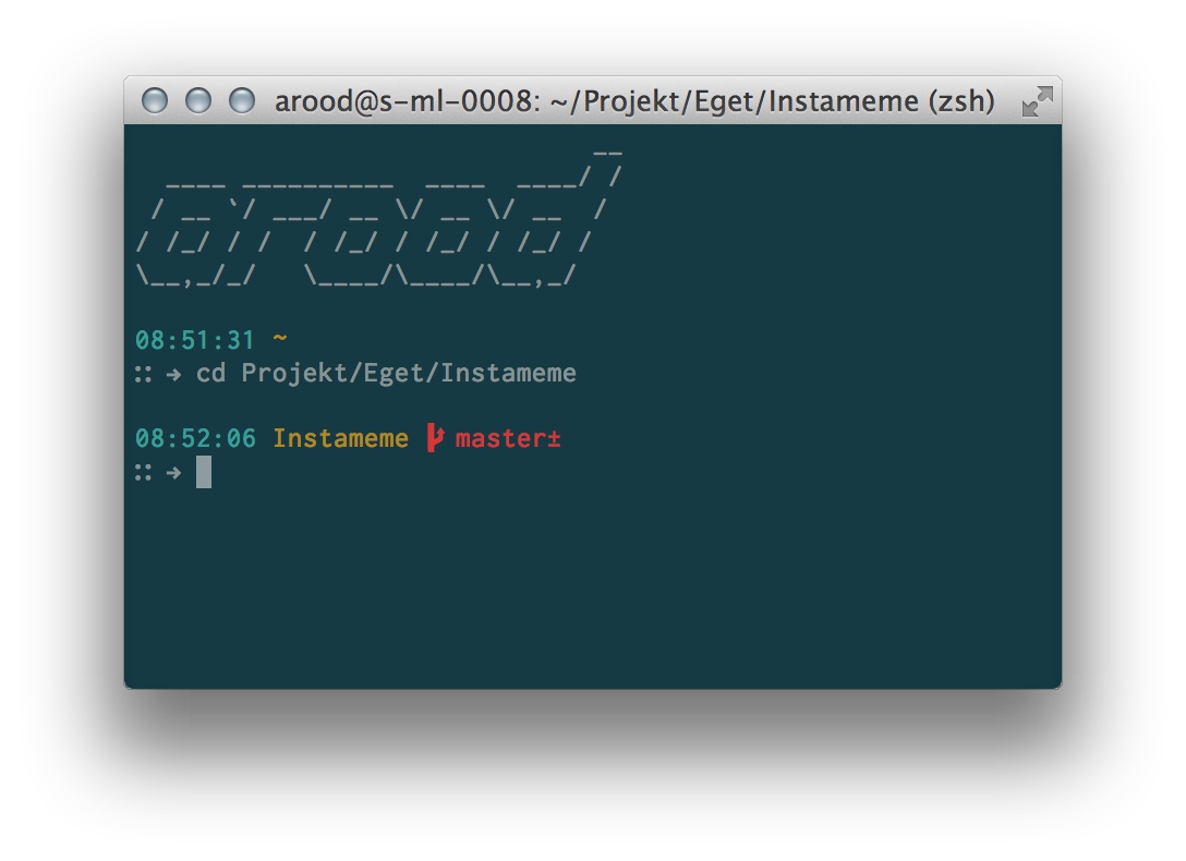 As you can see, it doesn’t show us very much information here. Most command prompts show things like the computer hostname or your username, but I already know this when I start my Terminal. But there are some more features hidden, that only shows up when I need them. The “arood” ascii is my MOTD, so it’s not a part of the theme! For example, if you’re hacking with a notebook in your bed or at a café, you’ll see a tiny battery indicator to the left, showing one dot for every 25% battery you have left. If the battery is charging, you’ll see a high voltage sign instead. And of course, a fully charged battery with a power source shows nothing. Also, if you’re working in a directory with a git repository, it will show you the current branch. If there are any changes that isn’t committed yet, you’ll see this as well.