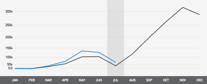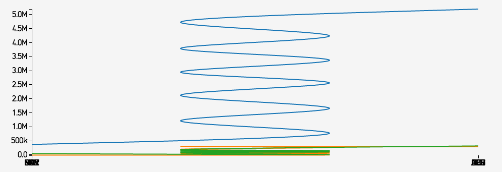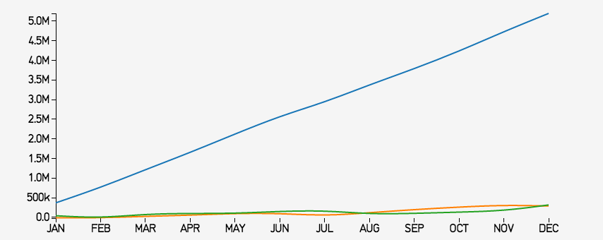 Wow, didn’t expect that! I think what I was trying to do here was getting the x-axis to show the names of the months, but they weren’t stored as Date-objects so I couldn’t use a time-scale. At some point, I accidentally made the graph look like this. After a while, I managed to get it working by using a simple linear scale, and map the indexes to the name of the month. Kinda feels like I’m cheating, but I think it’s the smoothest way unless I want to convert everything to Date-objects.