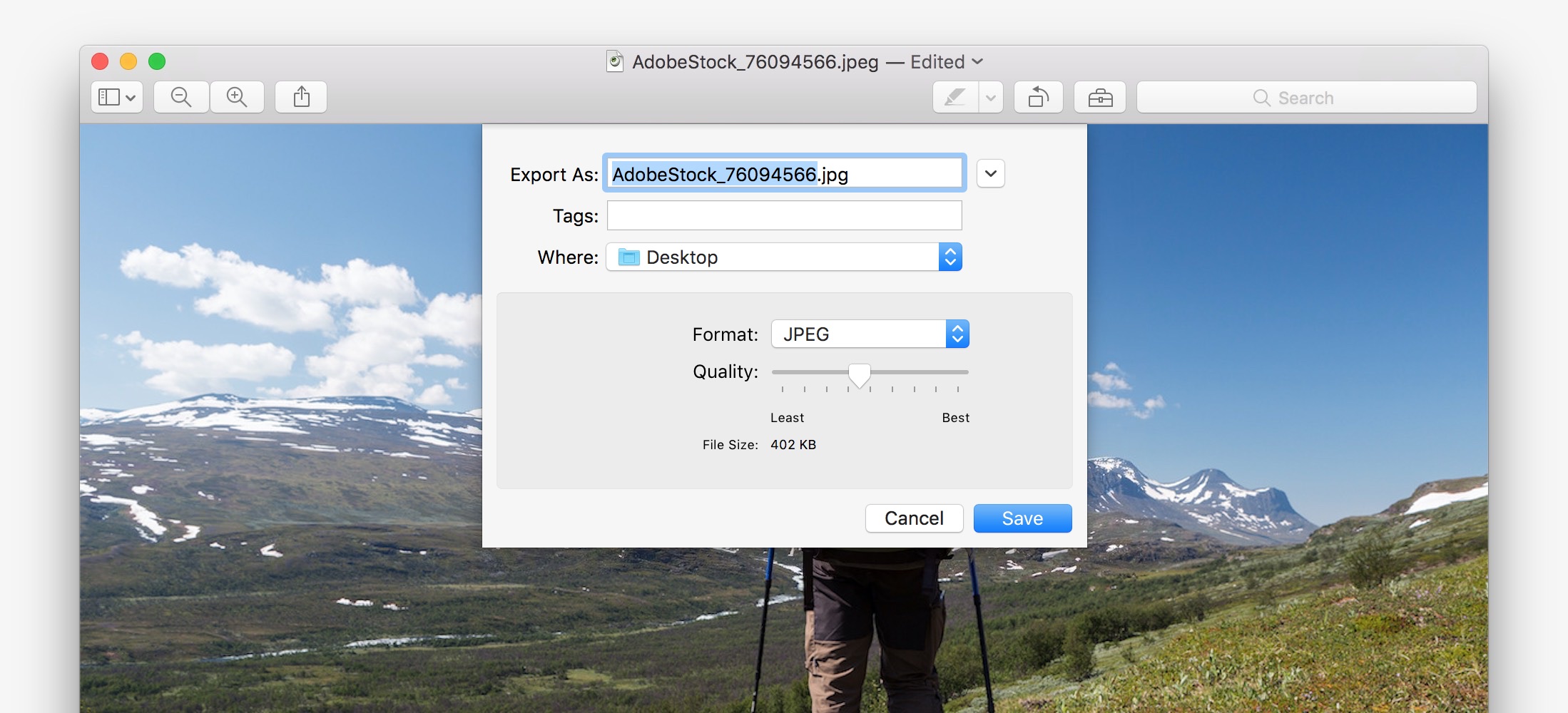 As you can see above, I had to turn down the quality a lot to fit into my 400 KB limit. If the final result turns out too bad, I’d probably see if I can crop it, resize it, or make an exception to the rule and let the file size grow. Applications like Photoshop shows a side-by-side comparison with the original and the compressed image, but sadly this isn’t the case with Preview. We’ll just have to see after we’ve saved it.